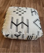 This pouf is carefully made from vintage Moroccan textile, featuring a soft cream base adorned with traditional black Berber symbols that reflect the deep cultural heritage of North African tribes. Each piece is one-of-a-kind, making it a distinctive addition to any living space.